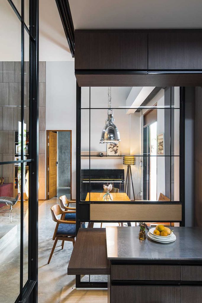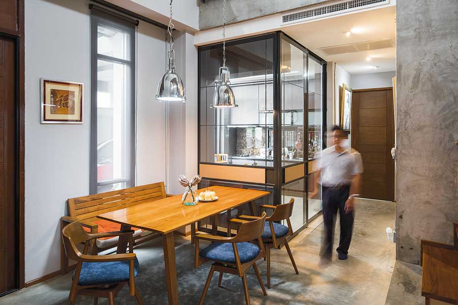 “ฟังก์ชันในบ้านผมก็ไม่มีอะไรมาก มีเฉพาะที่จำเป็นต้องใช้งานจริงๆ อย่างห้องนั่งเล่นผมเปิดโล่งเป็นโถงแบบดับเบิลสเปซให้เชื่อมไปถึงโต๊ะกินข้าวได้ ส่วนครัวก็ทำประตูกระจกบานเลื่อนสำหรับกั้นปิดเวลาปรุงอาหารเพื่อป้องกันเรื่องกลิ่นและควัน เวลาเปิดก็ช่วยให้ได้สเปซกว้างๆ ที่มองเห็นกันได้ง่าย ผมมองเผื่อระยะยาวด้วยว่าเวลาเราแก่เฒ่า ทำอะไรอยู่มุมไหนก็ยังอยู่ในสายตาของลูกได้”