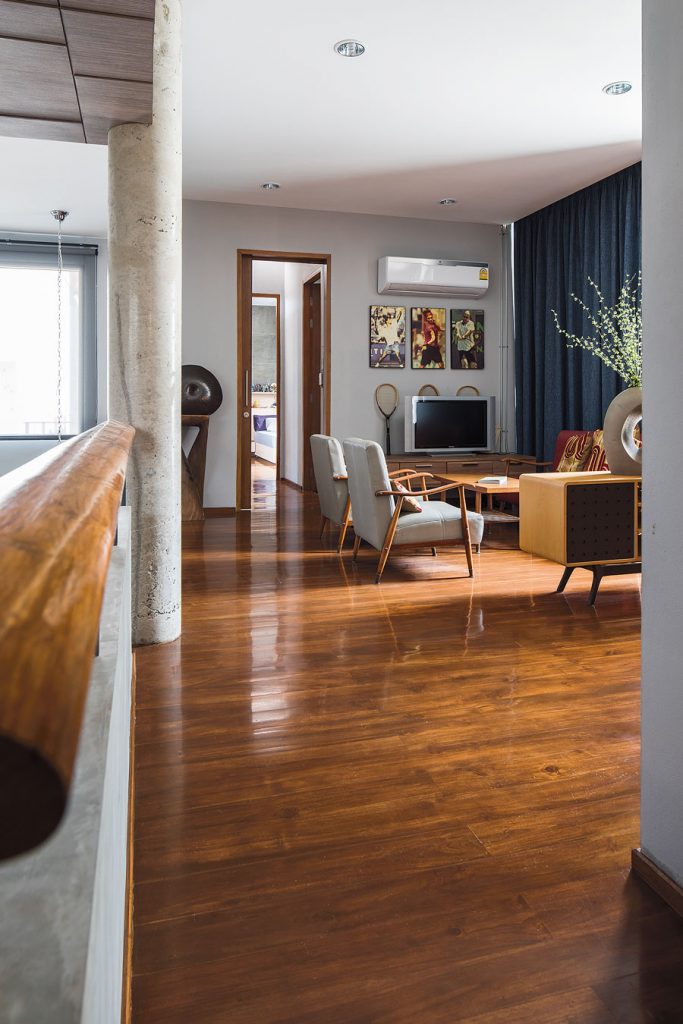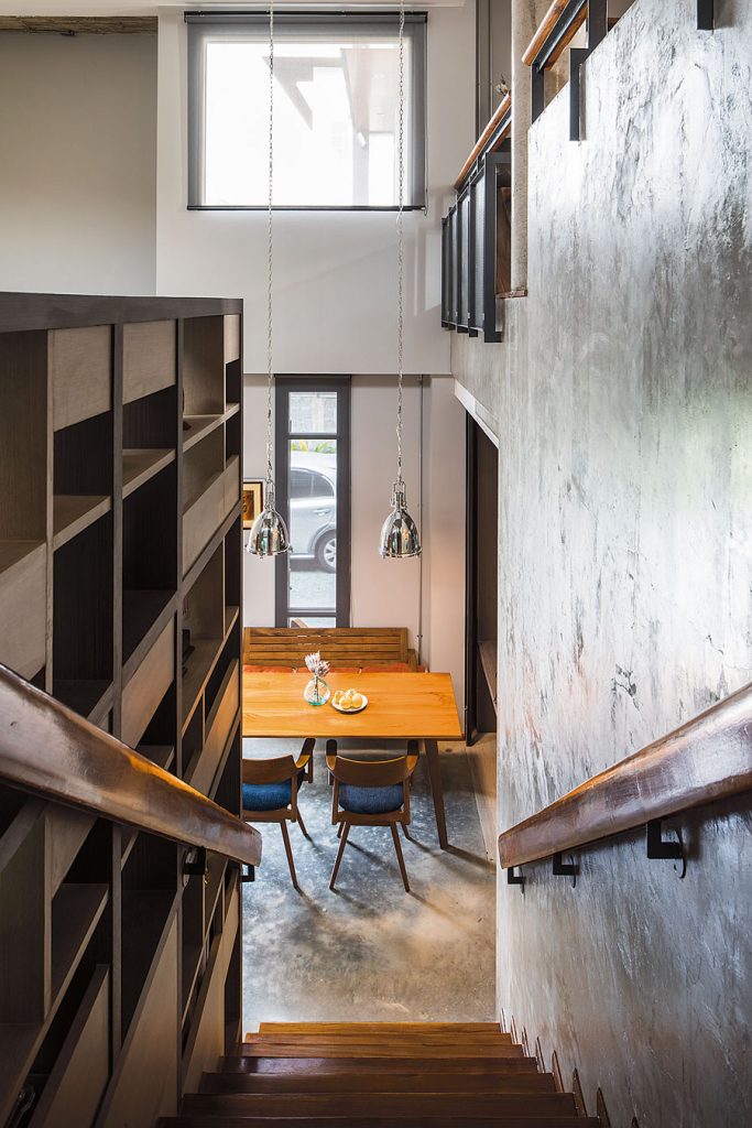 ส่วนบันไดทางขึ้นบ้านซ่อนตัวอยู่หลังชั้นวางของขนาดสูงใหญ่ซึ่งเป็นทั้งที่วางทีวี หนังสือ และถ้วยรางวัลซึ่งได้จากการแข่งกีฬาของลูกชาย โดยชั้นบนเป็นพื้นที่ห้องนอนของลูกชายซึ่งแยกฟังก์ชันให้เหมือนกับเพ้นต์เฮ้าส์ส่วนตัวที่สามารถขยายต่อเติมได้อีกในอนาคต