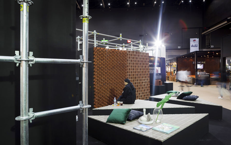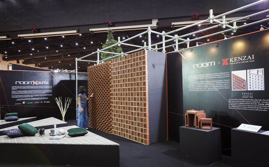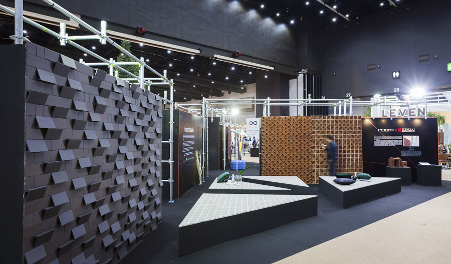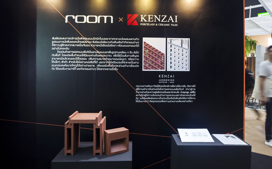 Kenzai x JUNSEKINO Architect and Design : ส่วนจัดแสดงกระบวนการพัฒนาวัสดุให้ตอบโจทย์การใช้งานได้มากขึ้น คือการให้ผู้ใช้งานเข้ามาเป็นส่วนหนึ่งในการออกแบบผลิตภัณฑ์ นำมาสูการทำงานร่วมกันระหว่างผู้ผลิตกระเบื้องเซรามิกเคนไซ กับ คุณจูน เซคิโน สถาปนิกผู้มีความโดดเด่นด้านการออกแบบสถาปัตยกรรมโดยใช้อิฐ จนได้ผลลัพธ์ออกมาเป็นกระเบื้องซึ่งมีเพิ่มฟังก์ชันการใช้งานให้เป็นมากกว่าวัสดุตกแต่งเพื่อความสวยงามเพียงอย่างเดียว