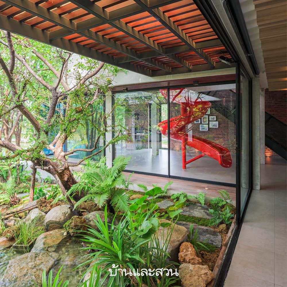 มุมมองจากประตูหน้าบ้านที่สามารถมองทะลุมาเห็นบ่อน้ำด้านในนี้จึงถูกกำหนดไว้แล้ว เพราะเป็นความร่มรื่นแรกที่เจ้าของบ้านอยากสัมผัส ได้เห็นสวน เห็นน้ำ และต้นลำพูเอียงโน้มต้นเลียดผิวน้ำตามธรรมชาติ เป็นการสร้างกรอบรูปให้วิวด้วยโครงสร้างทางสถาปัตยกรรม พร้อมเปิดรับแสงและลม สร้างสภาวะอยู่สบายจากสภาพแวดล้อมที่ตกทอดมาตั้งแต่รุ่นคุณปู่