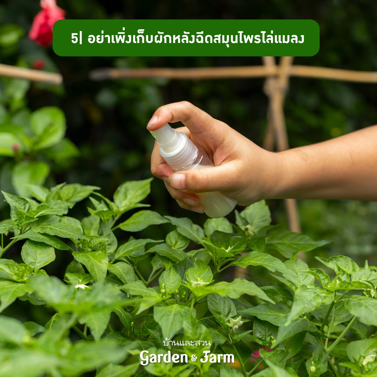 5 การปลูกผักอินทรีย์บางครั้งจะใช้สารไล่แมลงจากธรรมชาติ ซึ่งสารบางชนิดอาจส่งผลต่อรสชาติผักที่อวบน้ํามากๆ เช่น พริก สะเดา ฟ้าทะลายโจร ฯลฯ ดังนั้นหลังจากฉีดพ่นสารเหล่านี้ควรเว้นระยะสัก 1-2วัน จึงเก็บผักได้