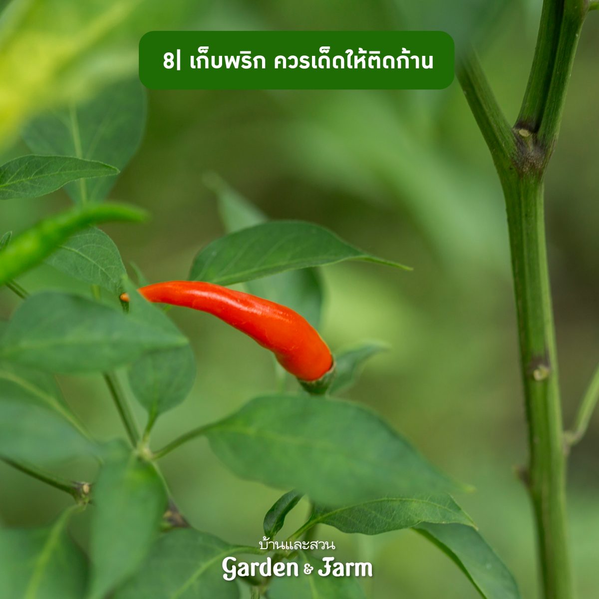 8 การเก็บพริกควรเด็ดให้ติดก้านออกมาเพื่อไม่ให้อาหารไปเลี้ยงส่วนที่เหลืออยู่แต่ต้องระมัดระวังไม่ให้กระเทือนต่อยอดอ่อนและดอกที่ผลิใหม่หากพริกที่ปลูกมีก้านเหนียวควรใช้กรรไกรตัด