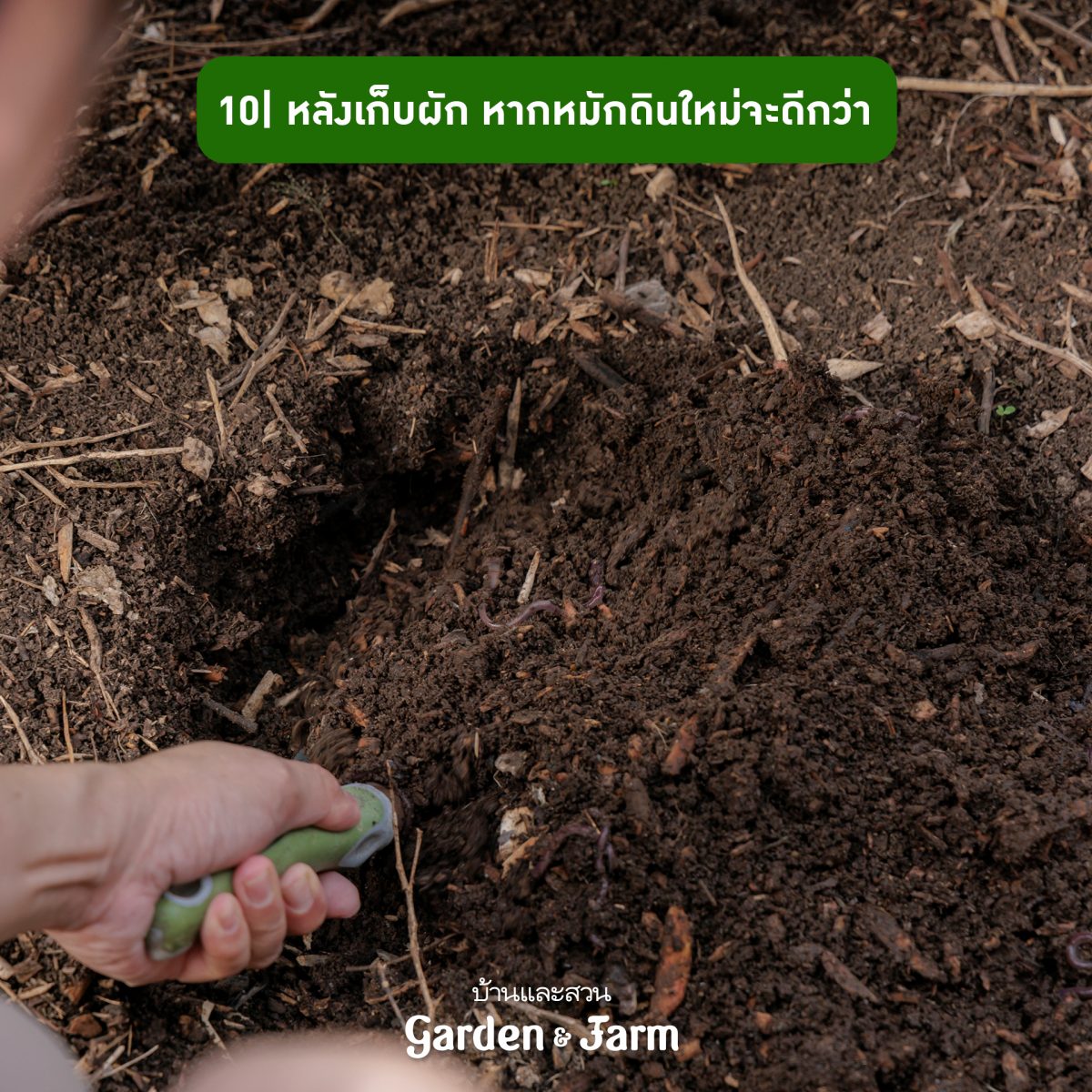 10 หลังจากเก็บเกี่ยว ควรเริ่มหมักดินใหม่เพื่อให้พืชผักที่ปลูกได้รับสารอาหารที่ครบถ้วนจากดินที่สมบูรณ์ โดยสูตรหมักดินต้องมีส่วนผสมของอินทรีย์วัตถุ ปุ๋ยคอก ให้มีความร่วยซุย ทิ้งไว้ประมาณ 2-4 สัปดาห์ (ขึ้นอยู่กับความสะดวก) จึงค่อยปลูกผักชุดใหม่