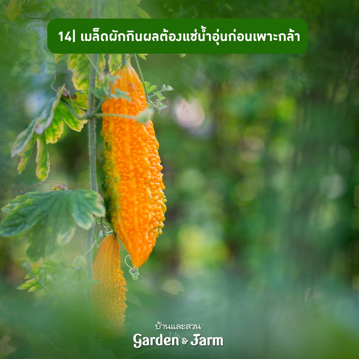 14.ผักรับประทานผลบางชนิด เช่น มะระ บวบ ถั่วฝักยาว แตงกวา ฟัก แฟง มะเขือ และมะเขือเทศ ควรนําเมล็ดมาแช่น้ำก่อนปลูก โดยใช้น้ำร้อน 1 ส่วน น้ำเย็น 1 ส่วนครึ่ง แช่ไว้ประมาณ 15 นาที หากเป็นเมล็ดที่มีเปลือกแข็ง อย่าง มะระ ให้ตัดเปลือกด้านบนออกนิดหน่อยก่อนแช่น้ำ ส่วนผักที่มียอดเลื้อยอย่าลืมทําค้างให้พืชผักเหล่านี้ด้วย