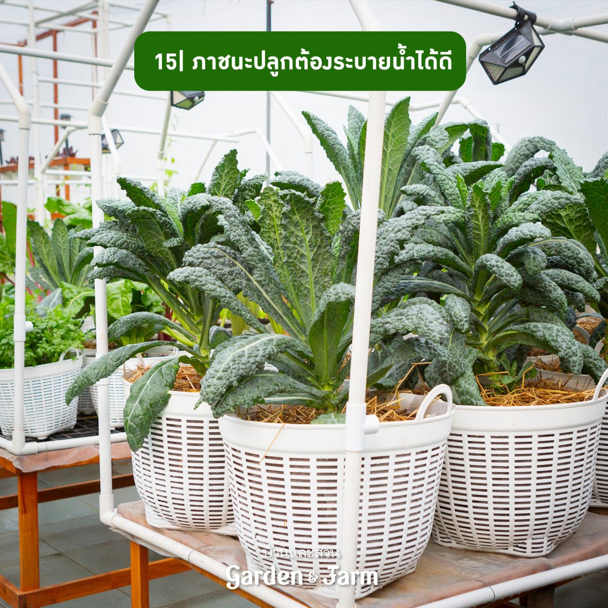 15 ไม่ว่าภาชนะอะไรก็ใช้ปลูกผักได้ แต่หัวใจสำคัญคือต้องระบายน้ำได้ดี ยิ่งหากมีลักษณะโปร่งมีช่องระบายอากาศได้ด้วยนั้นยิ่งเป็นผลดีต่อพืช อย่างเช่นตะกร้าพลาสติกที่นิยมใช้ปลูกผัก หรือเข่งขนมจีน อย่างที่ได้เห็นทั่วไป