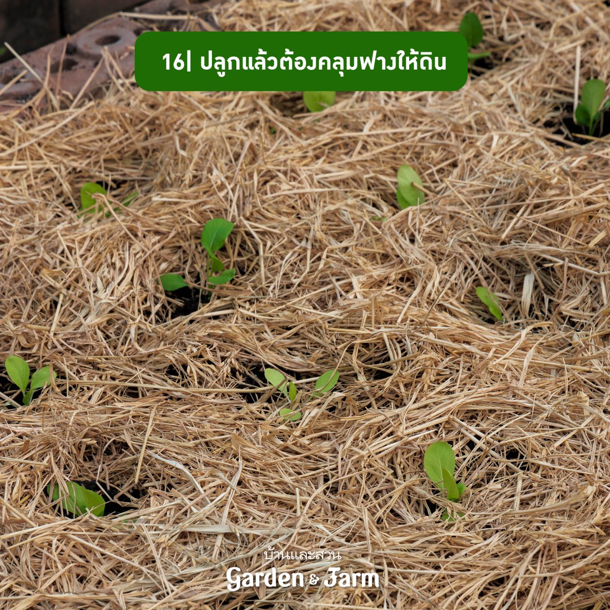 16 หลักปลูกผักแล้ว นําฟางข้าวมาช่วยคลุมแปลงผักเพื่อรักษาความชุ่มชื้นให้ผิวดิน และเป็นการปรับอุณหภูมิเพื่อเร่งกระบวนการเติบโตให้กล้าผักด้วย