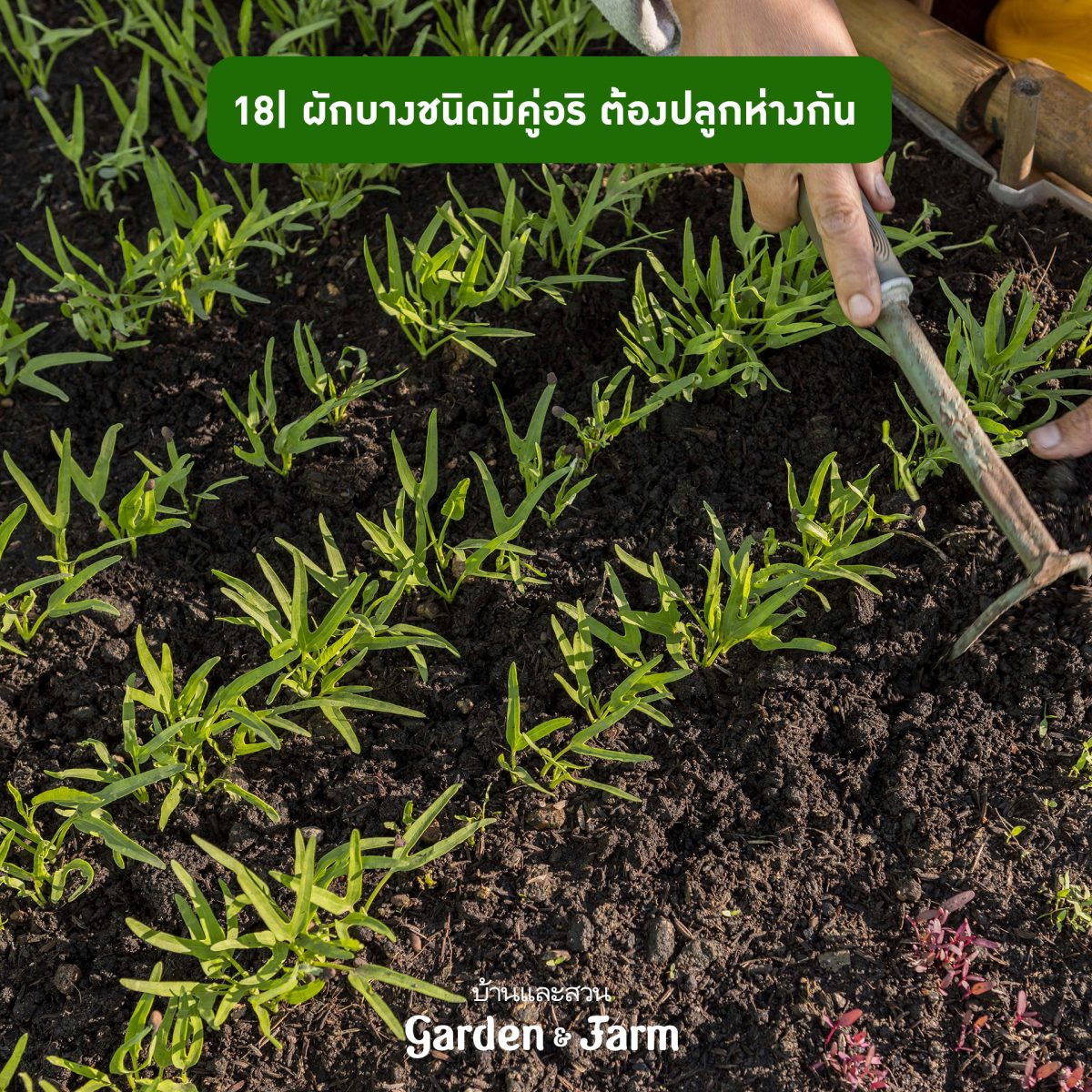 18 ผักบางชนิดก็มีคู่อริ เมื่อปลูกใกล้กันแล้วจะดึงดูดศัตรูพืชชนิดเดียวกัน ฉะนั้นควรรู้จักและเว้นระยะห่างในการปลูกอย่างน้อย 30 เซนติเมตร