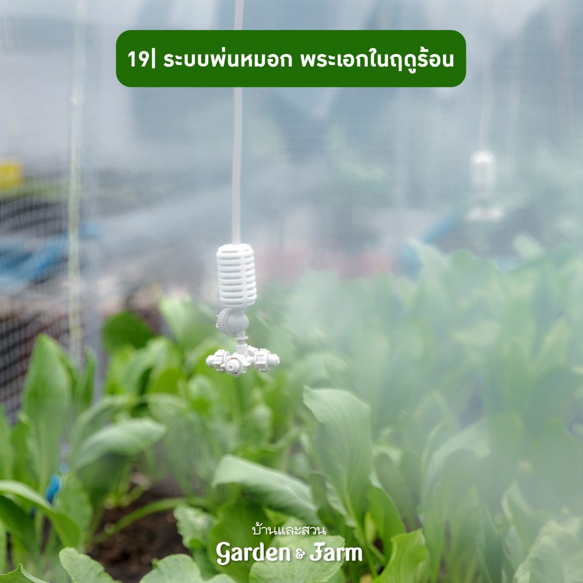 19 ระบบน้ำอัตโนมัติ ถ้ามีได้ก็ดี เพราะปัจจัยหนึ่งที่มีผลต่อผัก โดยเฉพาะผักสลัดคือ อากาศร้อน ในช่วงฤดูร้อนจึงจำเป็นต้องใช้ระบบพ่นหมอกช่วยลดอุณหภูมิในพื้นที่ปลูก รวมถึงเพิ่มการให้น้ำในช่วงกลางวัน หากติดตั้งระบบให้น้ำแบบอัตโนมัติก็จะช่วยดูแลผักได้ดีขึ้น