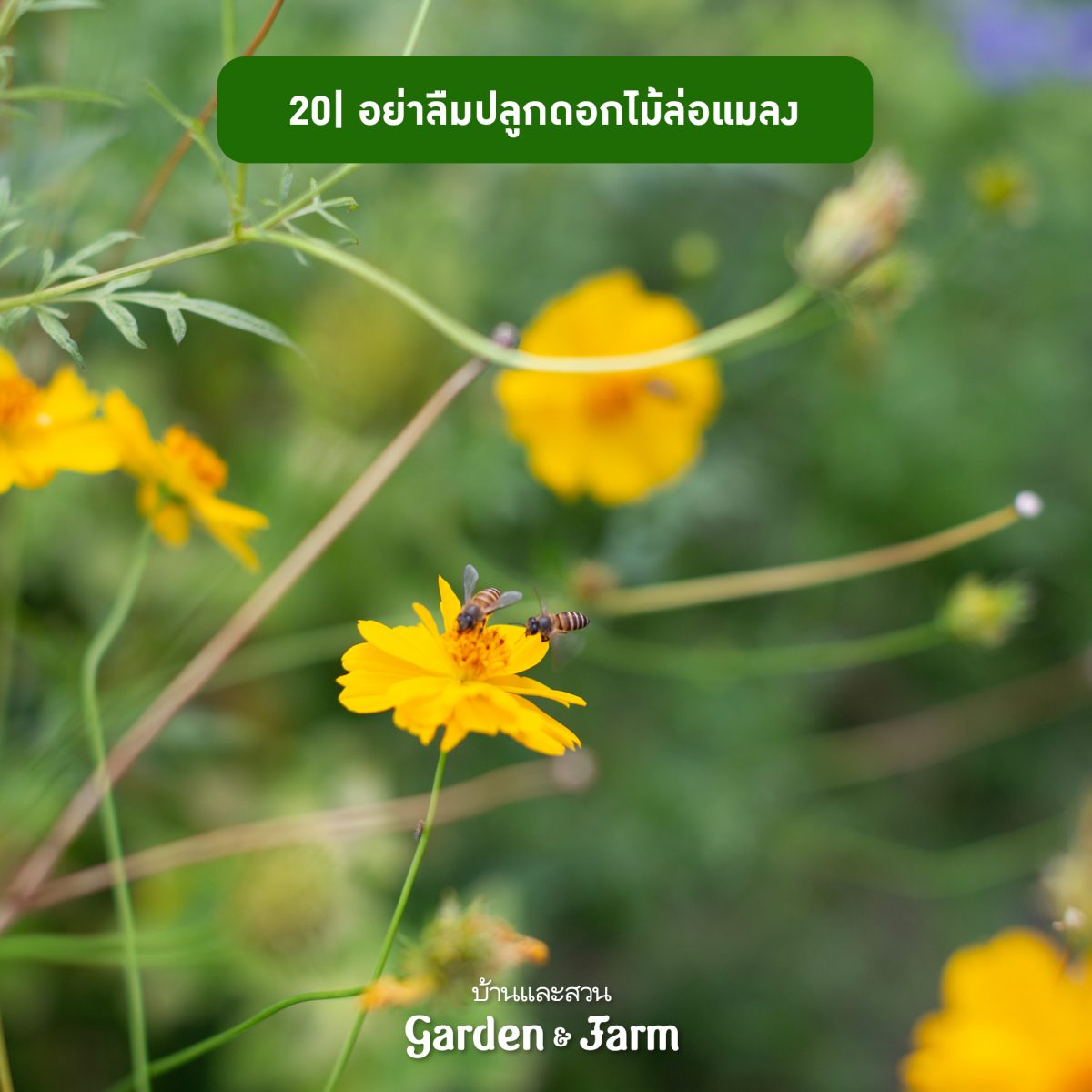 20 ปลูกไม้ดอกแซมในสวนเพื่อล่อแมลงช่วยผสมเกสร เช่น ผึ้ง ชันโรง ผีเสื้อ แมลงปอ โดยปลูกแยกในตำแหน่งใกล้ๆ กับแปลงพืชผักที่ปลูก แมลงเหล่านี้จะช่วยผสมเกสรให้พืชติดดอกออกผล