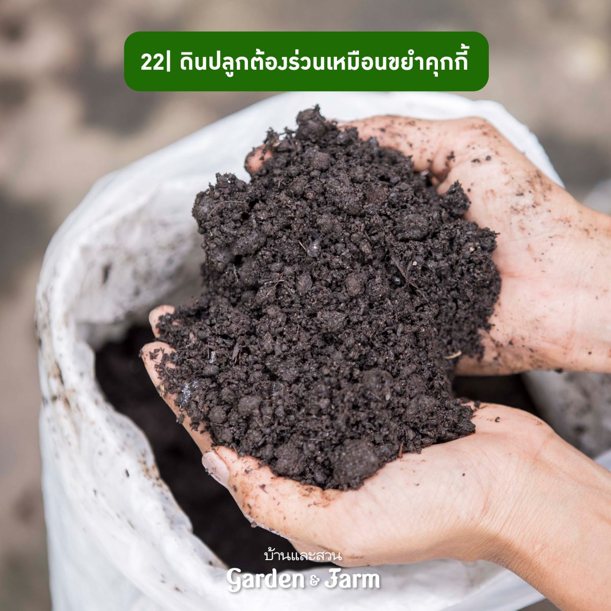 22 วิธีสังเกตดินที่มีโครงสร้างดินดี ทดสอบได้โดยการกำดินให้แน่นแล้วคลายมือออก หากดินร่วนซุยจะไม่จับตัวเป็นก้อนจะคลายตัวออกลักษณะเหมือนขนมคุกกี้โดนขยำ ซึ่งไม่ว่าดินจะอัดแน่นอย่างไรโครงสร้างก็ยังคงความร่วนซุยเหมือนเดิม