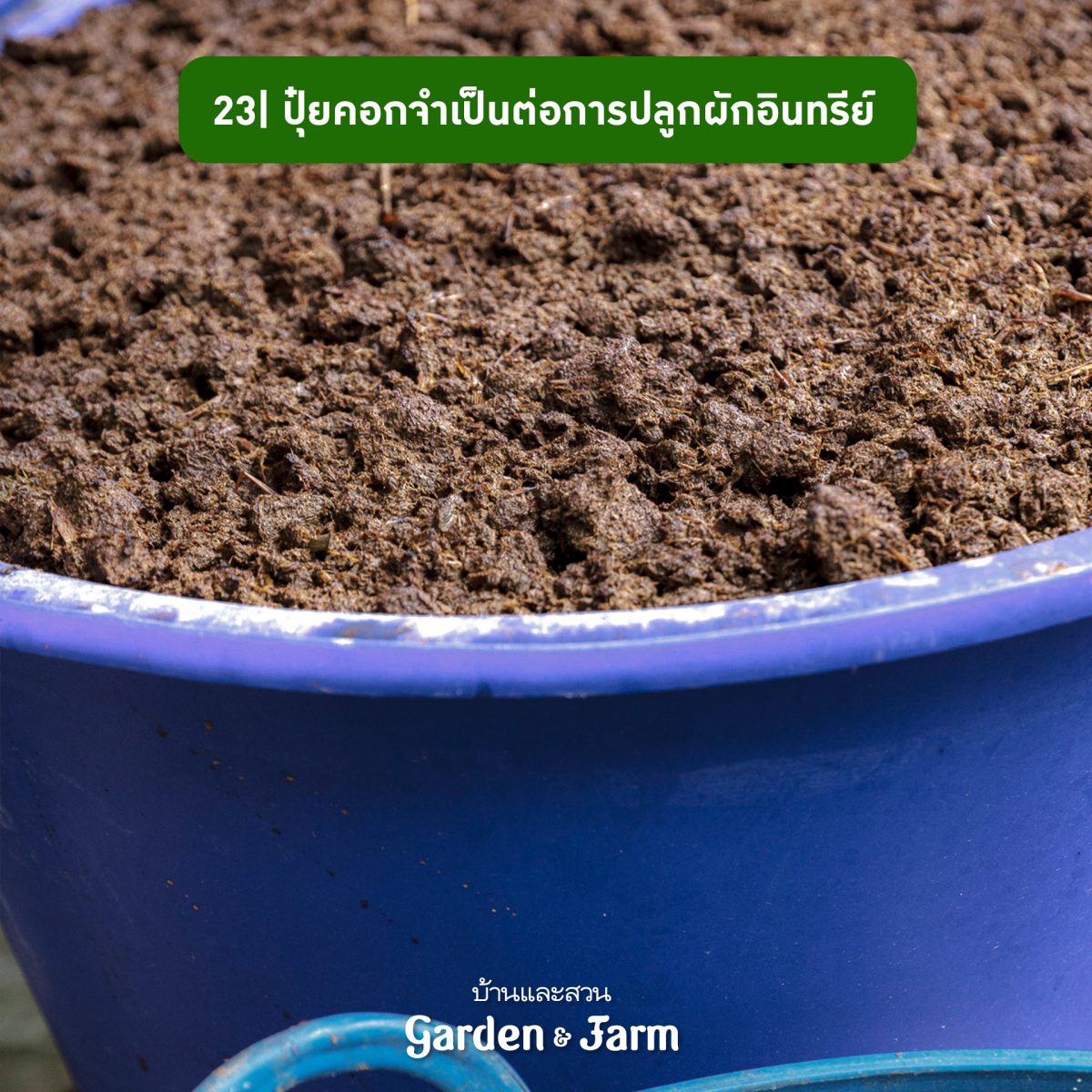 23 ปุ๋ยคอกเป็นปุ๋ยที่จำเป็นสำหรับสวนครัว เพราะช่วยปรับคุณภาพของดินให้โปร่ง ระบายน้ำดี ที่สำคัญยังช่วยรักษาความชื้นให้เหมาะแก่การเจริญเติบโตของผักด้วย