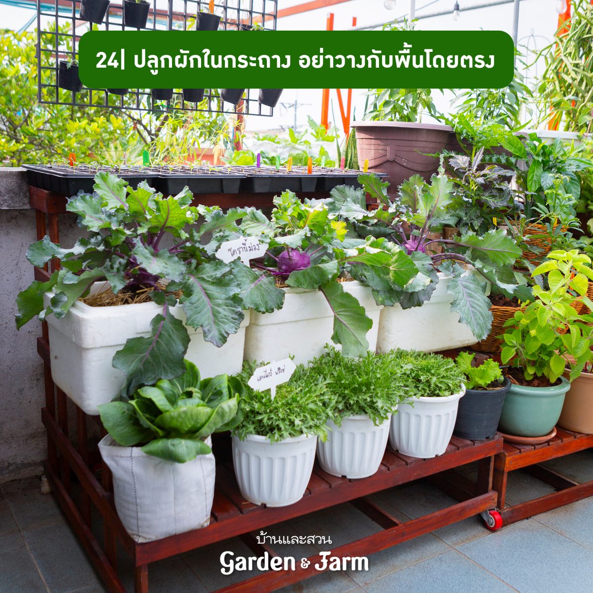 24 การปลูกผักในกระถางไม่ควรให้ก้นกระถางวางราบไปกับพื้น อาจจะใช้ขาตั้งหรือจานรองเพื่อระบายอากาศและระบายน้ำ