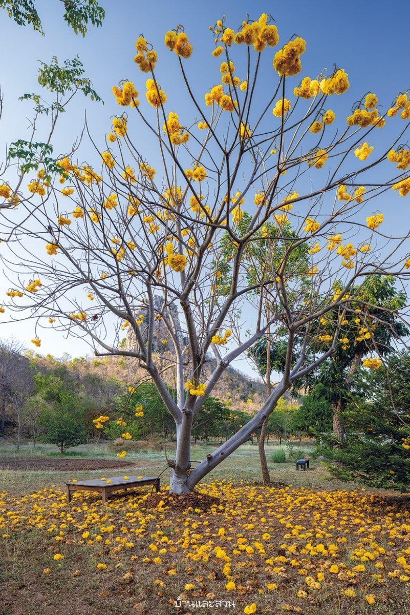“เพราะเป็นบ้านชั้นเดียว ผมจึงยกฝ้าเพดานในบ้านให้สูงพิเศษ ที่จริงจากพื้นจนถึงยอดจั่วหลังคาเกือบ 10 เมตร เลยมีพื้นที่ใต้หลังคาจั่วเยอะที่ไม่ให้ความร้อนลงมาปะทะในแนวราบ หลังคาจั่วด้านนอกก็ได้จากบ้านไทยในอดีตพร้อมชายคายื่นยาว 1.50 เมตรสำหรับกันแดดกันฝนสาด ผมเชื่อว่าการออกแบบบ้านที่ดีต้องให้เหมาะกับสภาพแวดล้อมและภูมิอากาศด้วย ที่สำคัญคือพ่อกับแม่ผมปลูกต้นไม้ไว้รอบบ้านเยอะมากเป็นเหมือนงานศิลปะของเขาเลย ปลูกตั้งแต่ก่อนสร้างบ้านอีก คือเลือกซื้อต้นที่สูงปานกลางทั้งไม้ใบ ไม้ดอก และไม้ผล ค่อยๆ ลงทีละต้นพลิกจากที่ว่างเปล่าให้กลายเป็นสวนป่ารอบบ้าน ต้นไม้เลยเติบโตมาพร้อมกับการสร้างบ้านและให้ร่มเงาที่ดีมากๆ เรายังมีต้นไม้ที่ออกดอกต่างสีสันกันไปในแต่ละฤดูกาล มีตะแบก จามจุรี หางนกยูง กัลปพฤกษ์ ราชพฤกษ์ พวงชมพู สุพรรณิการ์ เวลาอยู่ในบ้านเราจึงสนุกกับการนั่งมองดูฤดูกาลที่เปลี่ยนแปลงจากความเคลื่อนไหวของธรรมชาติ ต้นไม้หน้าแล้งจะออกสีเหลืองๆ พอเข้าหน้าฝนก็กลายเป็นเขียว แล้วก็มีไม้ดอกสลับไปมาในแต่ละมุมห้อง ซึ่งถ้ามองจากภายนอกจะเห็นเป็นกลุ่มต้นไม้เขียวๆ ที่โอบล้อมตัวบ้านไว้ให้ความรู้สึก Humble หรืออ่อนน้อมร่วมไปกับธรรมชาติดี”