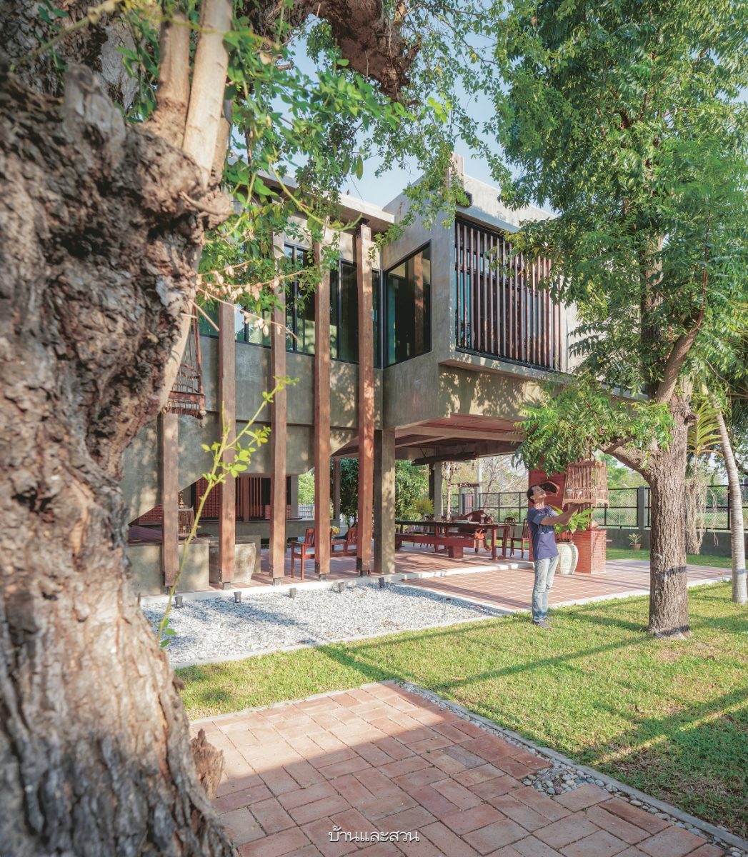 บ้านหลังนี้ยกใต้ถุนสูงถึง 3 เมตร โดยทำโครงสร้างคอนกรีตเสริมเหล็กในชั้นแรก ส่วนชั้นสองเป็นโครงสร้างเหล็ก อิงรูปแบบมาจากบ้านเรือนไทยสมัยก่อนที่นิยมมีใต้ถุนบ้านไว้ใช้ประโยชน์และทำกิจกรรมต่าง ๆ ซึ่งผลพลอยได้จากการยกใต้ถุนสูงนี้ทำให้ได้พื้นที่จอดรถเพิ่มขึ้น หรือในอนาคตหากต้องการกั้นห้องเพื่อใช้สอยก็สามารถทำได้เลย นอกจากนี้ยังได้ประโยชน์เรื่องวิวเพราะบนระเบียงชั้นสองที่มีระดับค่อนข้างสูงสามารถมองเห็นวิวทิวทัศน์ในมุมมองที่ต่างออกไปและรับลมได้ดีขึ้น >> อ่านต่อ