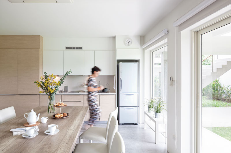 สถาปนิกได้ออกแบบการเข้าสู่ตัว บ้านสีขาว ผ่านพื้นที่เล็กๆ แล้วค่อยนำพาไปสู่การเปิดเผยพื้นที่เปิดโล่งด้านในได้อย่างต่อเนื่อง มีจุดนำสายตาระหว่างทาง จนกระทั่งมาสู่สนามหญ้าสีเขียวที่อยู่ภายใน ซึ่งชวนให้รู้สึกได้ว่าเป็นสถานที่พิเศษเฉพาะบุคคลอันเป็นที่รักเท่านั้น